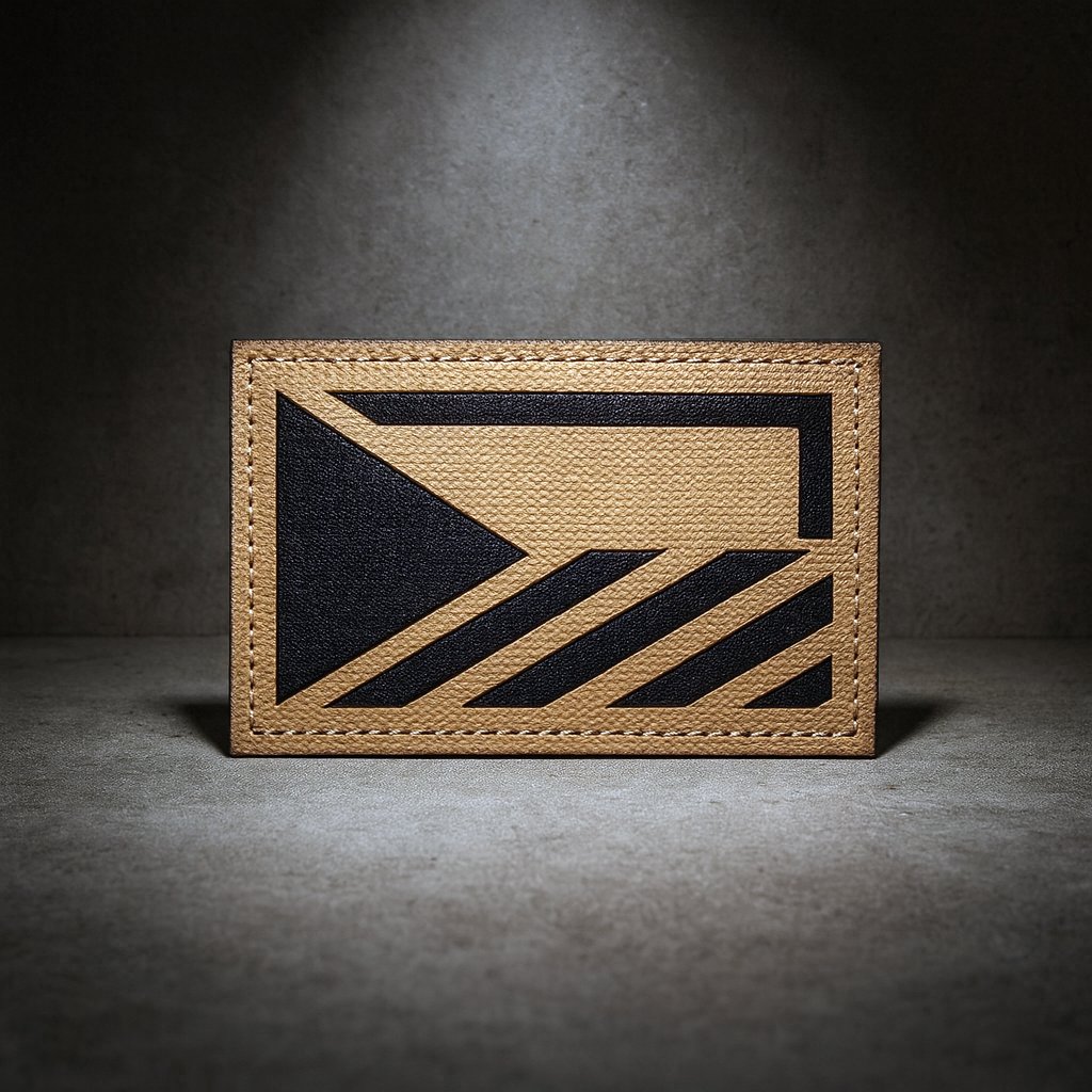 - Desert / khaki camo – potlačené barvy, které neruší maskování, ale tvar vlajky je stále dobře čitelný.