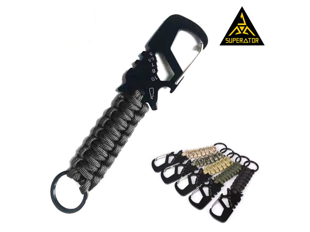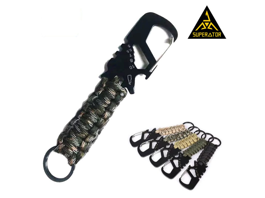 | Materiál: | Pletený Paracord 550 (nylon) + kovová karabina/nástrojová část; lehké a odolné. |