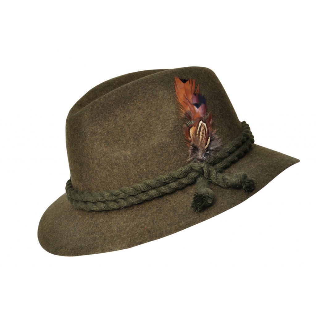 Myslivecký klobouk Arthur, 100% vlněná plsť, zdobený silnější bavlněnou splétanou šňůrou a svazkem bažantích pírek, textilní potní pásek Werra Hunting.