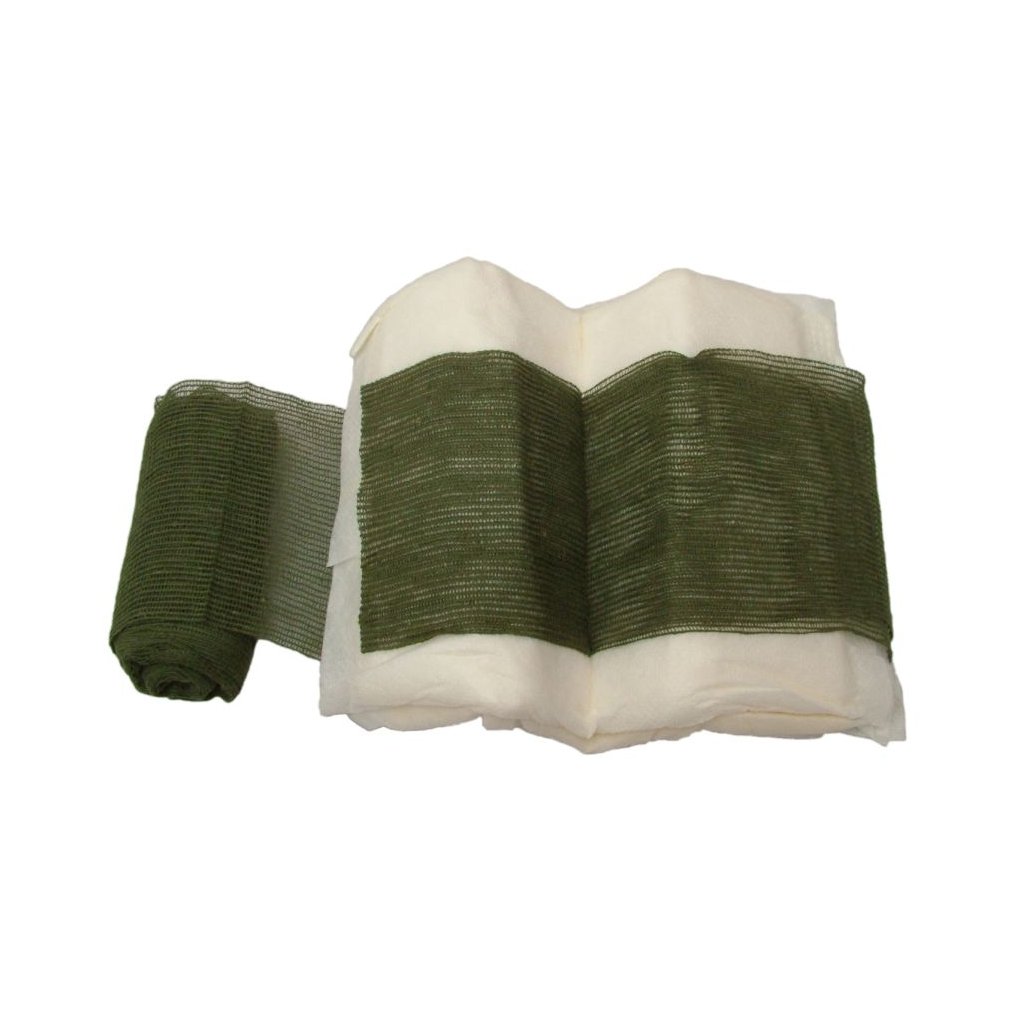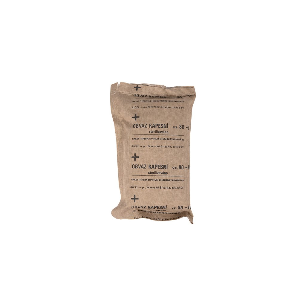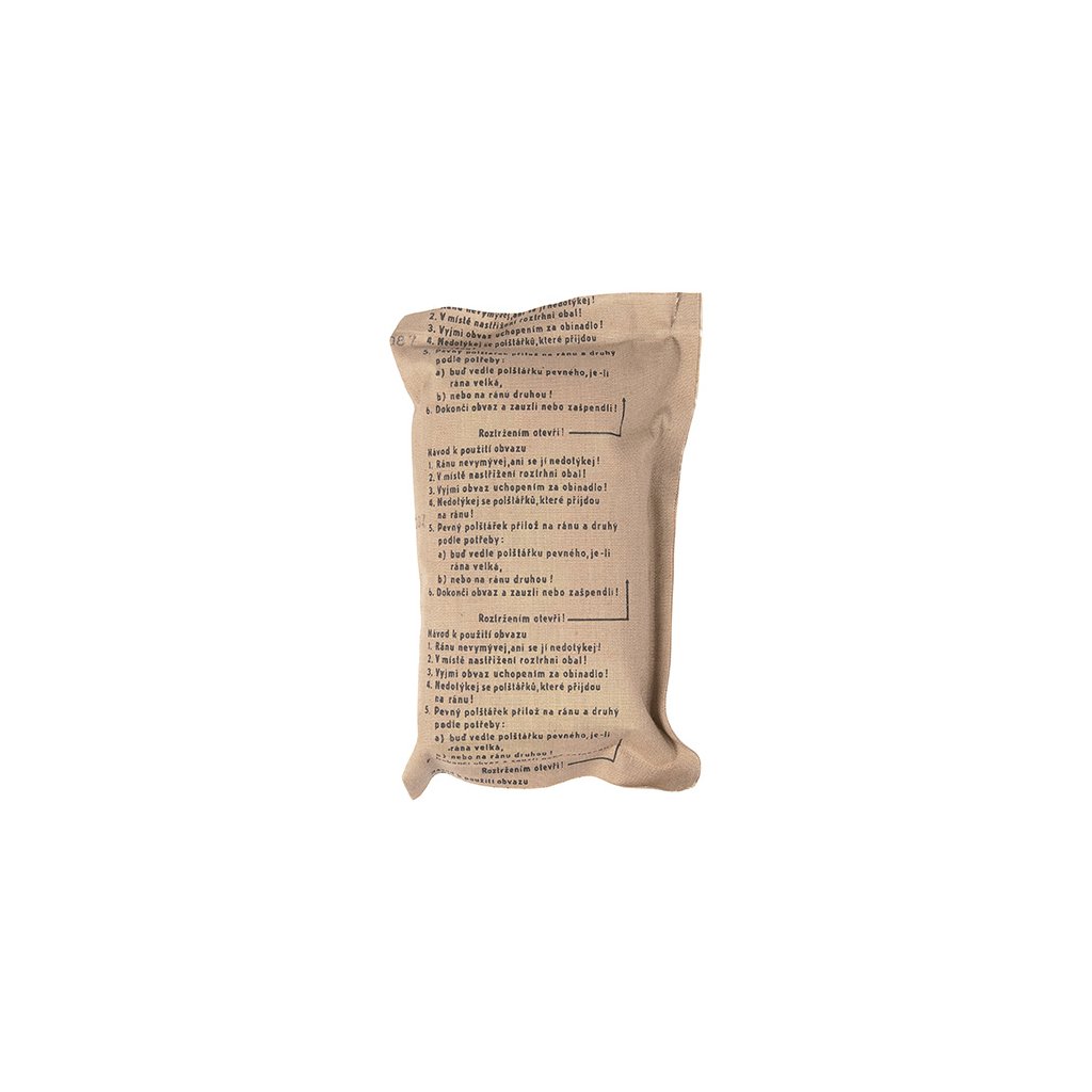 Originální kapesní obvaz AČR. Komplet se skládá z obvazu v khaki barvě, obinadla a spínacího špendlíku. Sada je nová, nepoužitá, ze skladů České Armády ( tzv. uloženky ). Polštářky jsou složeny ze čtyř funkčních vrstev: