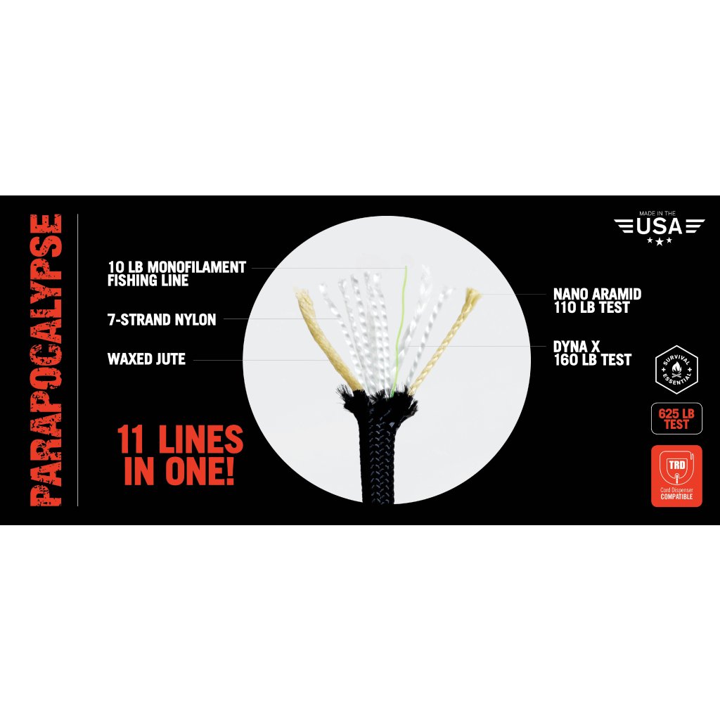 Parapocalypse 625lb je nejsofistikovanější verze oblíbené padákové šňůry s tloušťkou pouhých 4 mm. Je navržena s ohledem na každý scénář přežití mimo civilizaci i ve městě. Nejen, že získáte všechny výhody běžného paracordu, ale navíc další provázkyse specifickými vlastnostmi pro přežití. Uvitř naleznete standartních sedm nylonových provázků spletených ze dvou pramenů. Navíc je zde i vlasec, voskovaný jutový provázek, Micro Cord a specialní provázek Dyna-X.