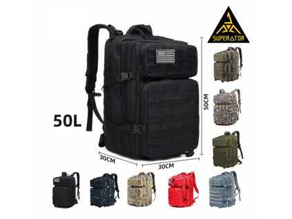Velkokapacitní batoh Bederní popruhZapínání na zipVnitřní přihrádkaKapacita 50LRozměr 50*30*30 cm1000D NylonHmotnost 1,3 kg Nášivka vlajka USA na suchý zip.