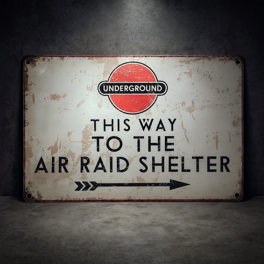 Sběratelská replika směrové cedule do protileteckého krytu z období letecké bitvy o Londýn. Motiv vychází z označení londýnského metra a civilních krytů, která pomáhala civilistům dostat se během náletů do bezpečí v době, kdy byl Londýn pod útokem Luftwaffe a země stála pod vedením Winstona Churchilla.