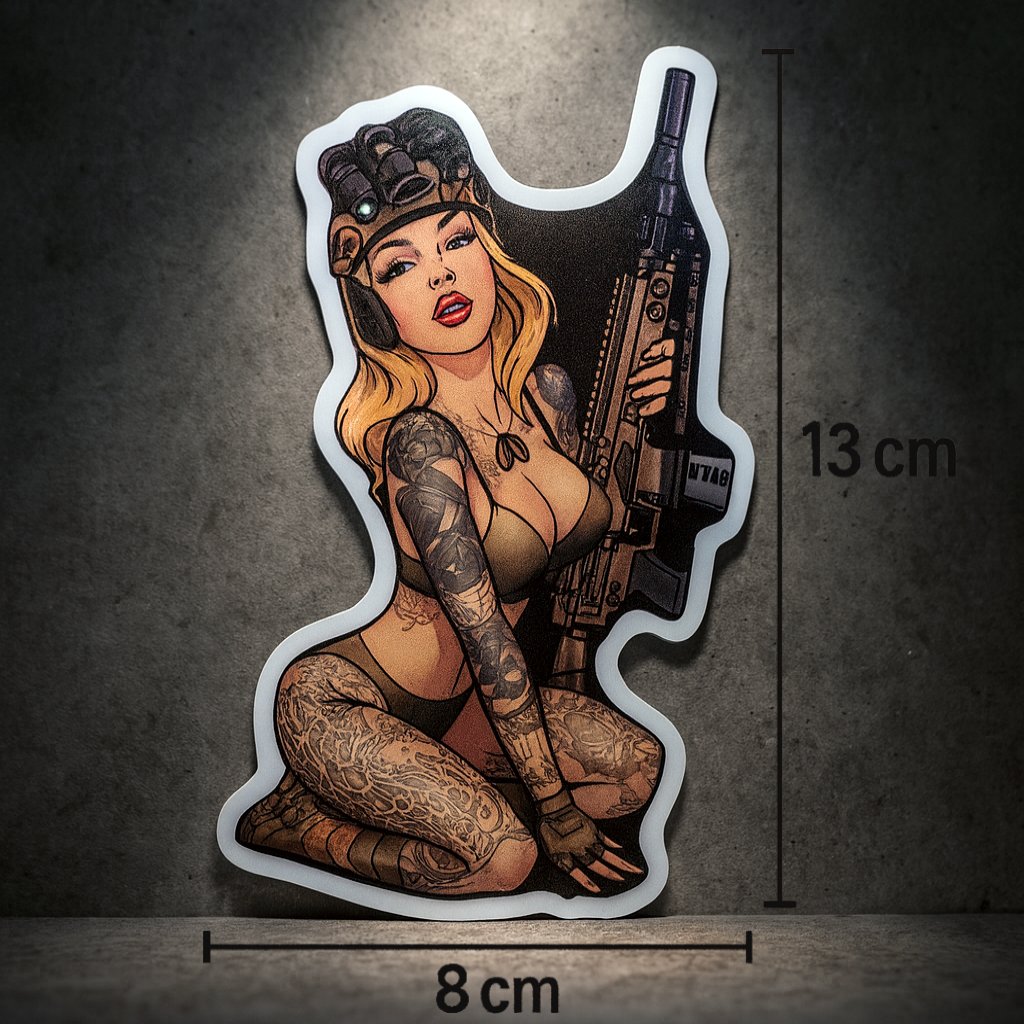 Tahle samolepka je poctou klasickým pin-up motivům z americké kultury poloviny 20. století – jen v moderním military provedení. Dívka s lehkým kulometem M249 v rukou vypadá, jako by právě vyrazila z hangáru US Army přímo na tvůj nárazník auta nebo zbraňový kufr.