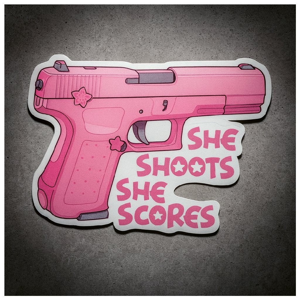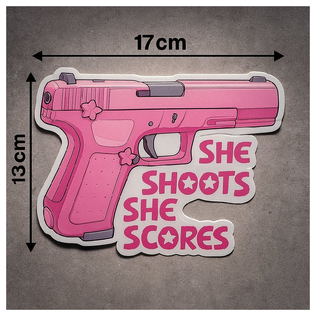 Tahle velká vinylová samolepka na auto s růžovou pistolí a nápisem She Shoots She Scores je určená pro ženy, které milují střelbu, mají rády humor a zároveň chtějí, aby bylo na první pohled jasné, že nejsou jen „spolujezdkyně“, ale plnohodnotné střelkyně.