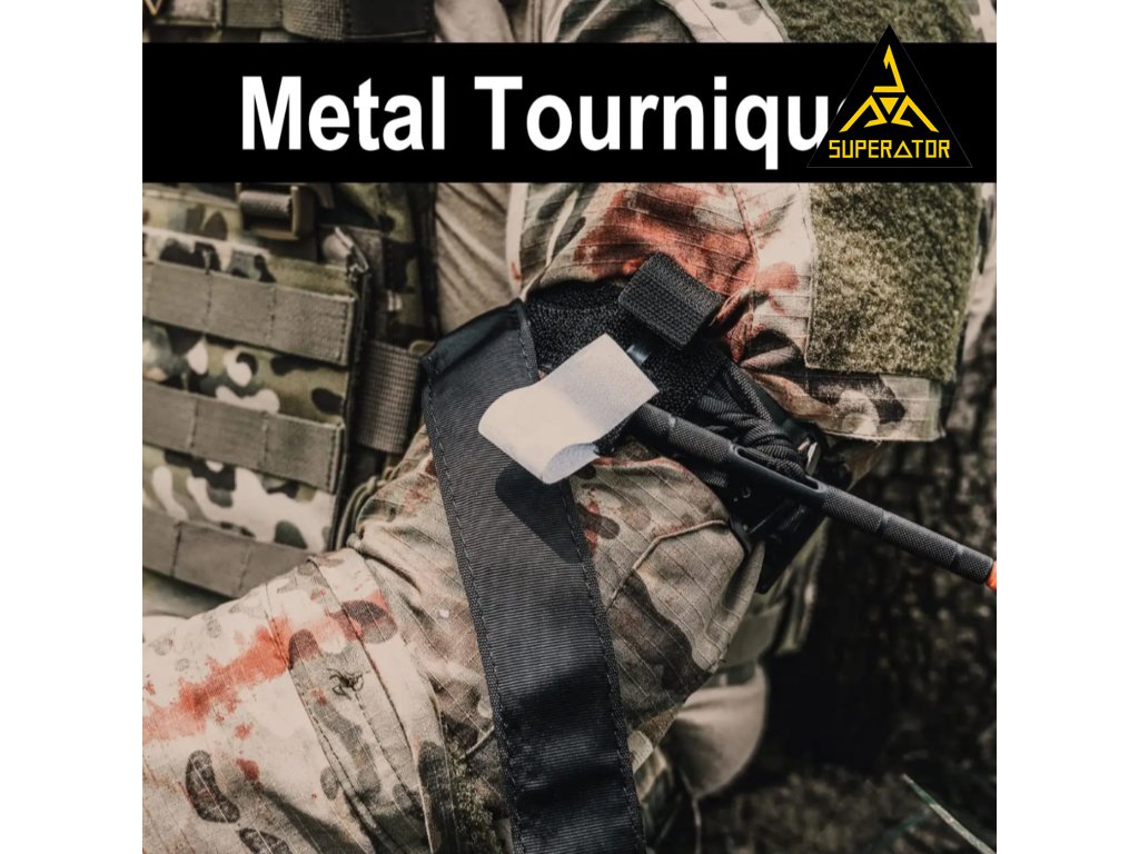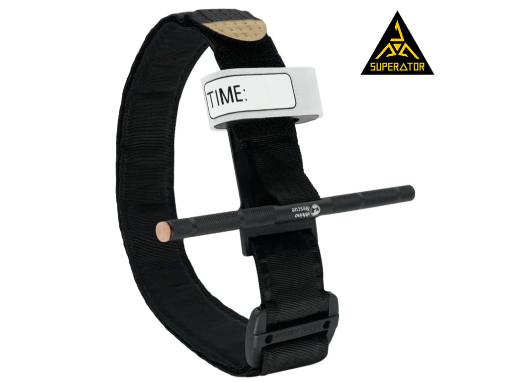 | Jak funguje: | Páska se provleče single-routing přezkou, dotáhne a kovové vratidlo několika otočkami zvýší tlak až k úplné okluzi; zajištění V-clip zámkem, čas se píše na štítek TIME. |