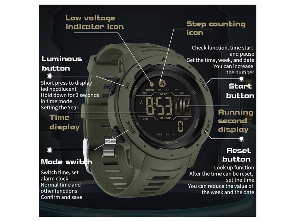 Digitální hodinky s vojenským designem, ideální pro venkovní i vnitřní sporty, jako je běh, horolezectví, rybaření, procházky, turistika.