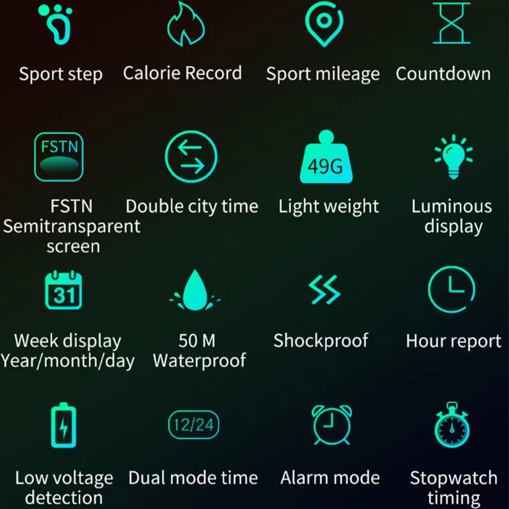 - Funkce: čas/datum, duální čas, stopky, odpočet, krokoměr, kalorie, vzdálenost, budík, hodinový signál