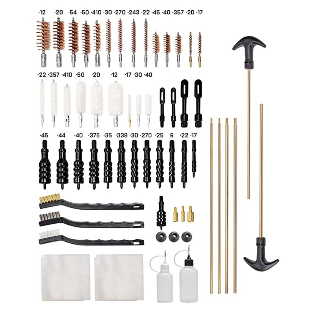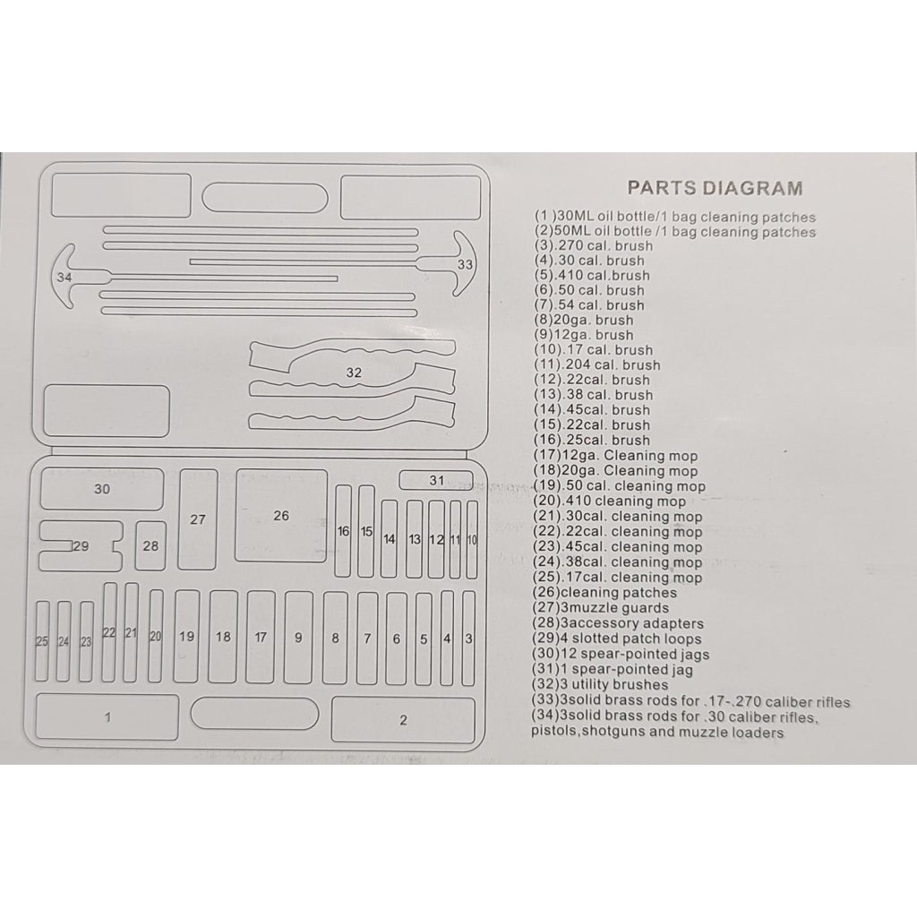 Obsahuje vytěráky pro téměř všechny typy běžných zbraní a kalibrů.